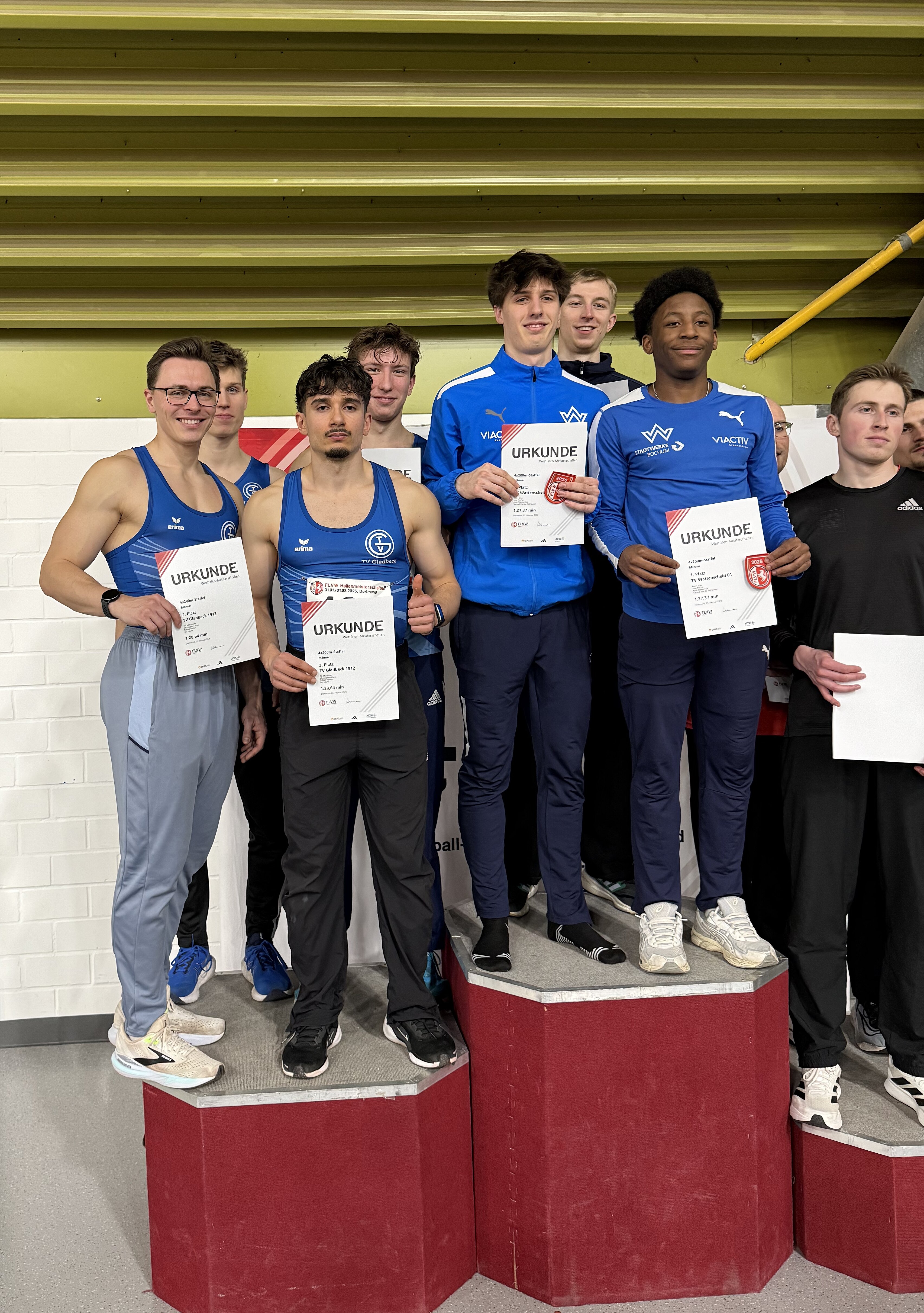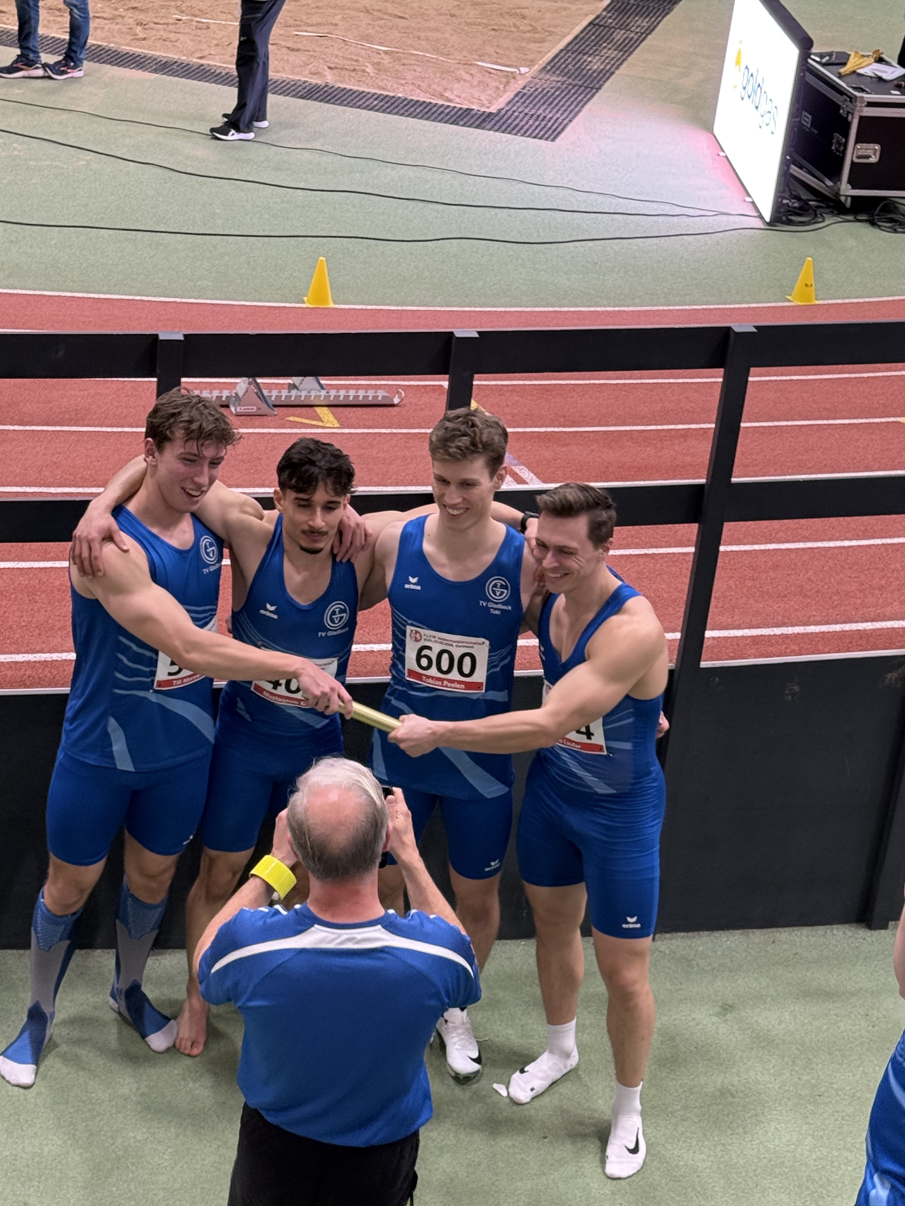 Da wollte die Männerstaffel mit Till Morawietz, Mustaqeem Kiani, Tobias Peelen und Jan Laufer nicht nachstehen. In einem spannenden Rennen mit dem TV Wattenscheid unterboten die Blauhemden mit 1:28,64min als 2. die B-Norm für die Deutschen Hallenmeisterschaften an gleicher Stelle Ende Februar. Sie steigerten damit, trotz des verletzungsbedingten Ausfalls von Abinayan Uruthiran, ihre Bestzeit aus dem Vorjahr um mehr als 1,5 Sek.