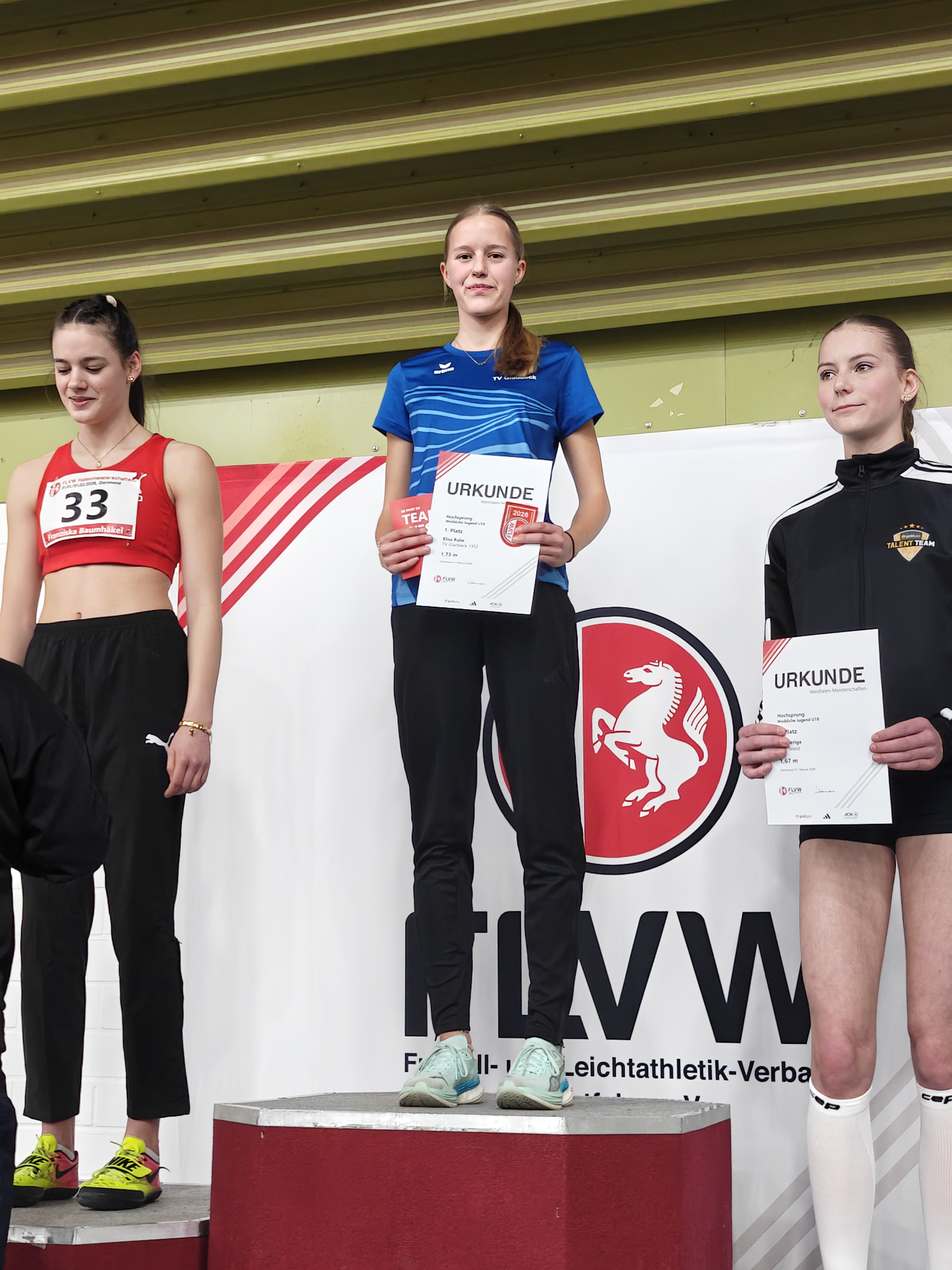 Besser machte es da Eisa Rabe im Hochsprung der weiblichen U18. Sie sprang sich in einem starken Feld in einen Höhenrausch und pulverisierte ihre Bestleistung um 6cm. Als neue Westfalenmeisterin mit 1,73m mit U20 DM Norm konnte die 16 jährige ihr Glück kaum fassen.