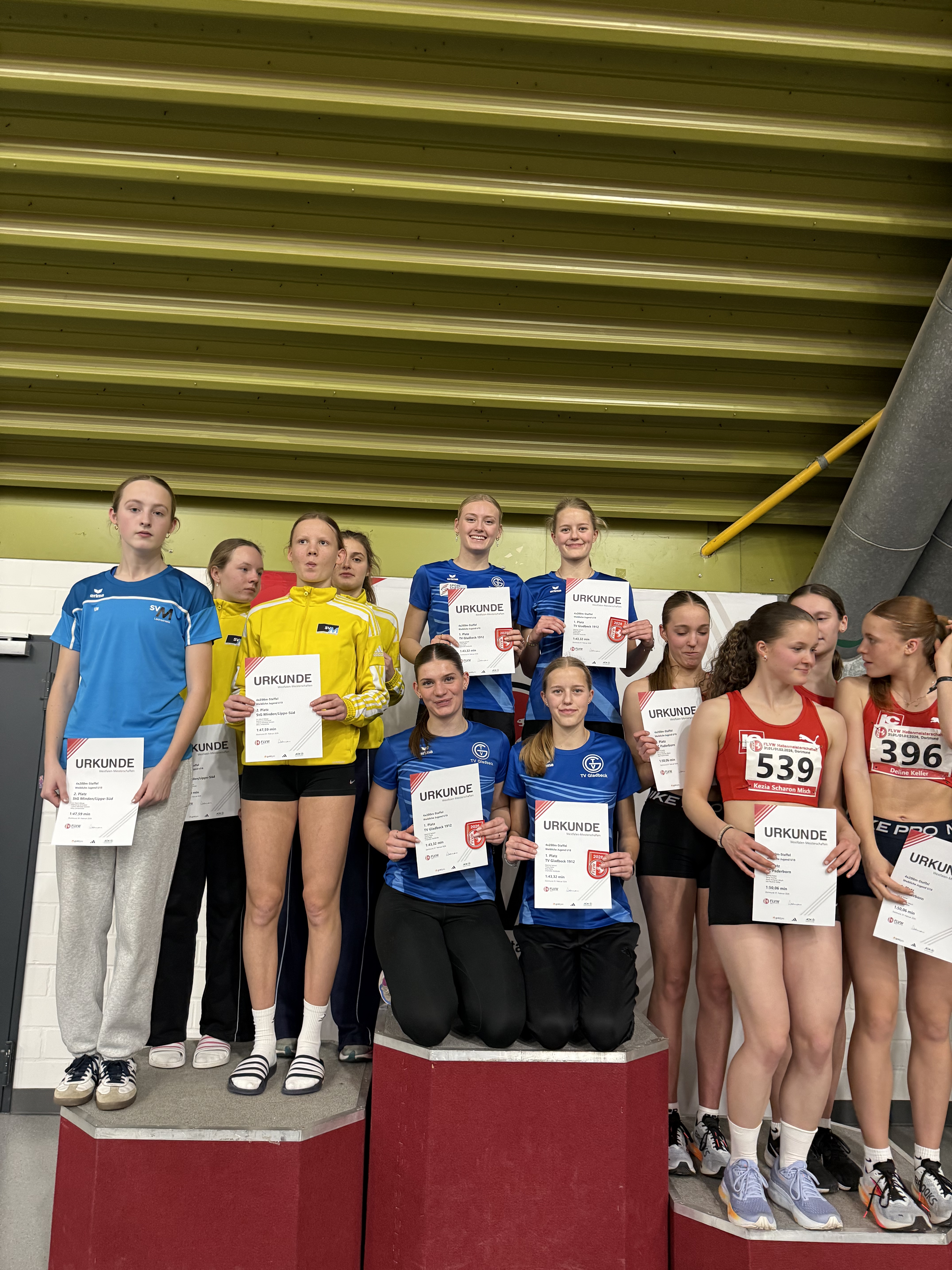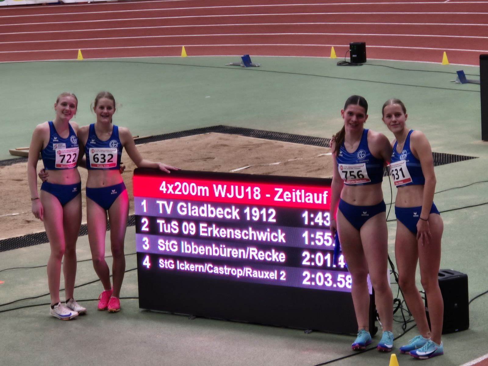 Zum Abschluss des Tages standen die 4x200m Sprintstaffeln auf dem Programm und die U18 Mädels hatten sich für das Finale einiges vorgenommen, nachdem die DM-Norm bereits abgehakt war, wollten Matilda Seibert , Thalia und Elisa Rabe und Charlotte Swoboda mit einer Topp Zeit den Titel einfahren. Dieses Vorhaben erfüllten die 4 in bravouröser Manier und liefen als Westfalenmeisterinnen nach 1:43,32min durchs Ziel und setzten sich an die Spitze der Deutschen U18 Bestenliste.